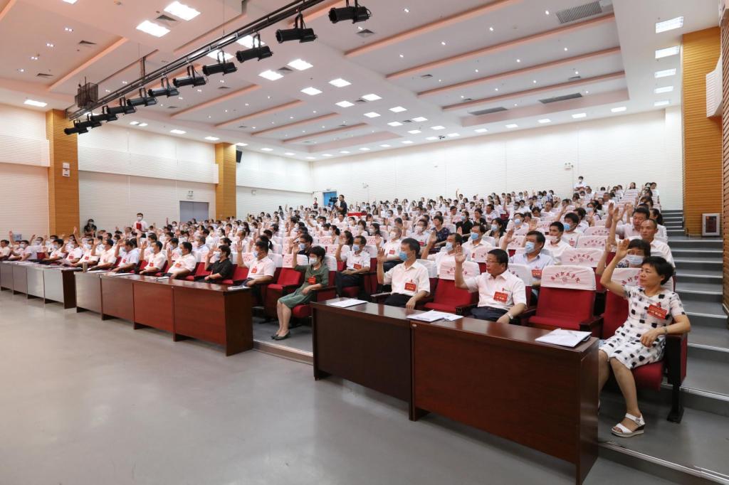 在雄壮的《国际歌》中,学院第六届教职工代表大会暨工会第六届会员代表大会第一次会议胜利闭幕。(鞠发营供稿)