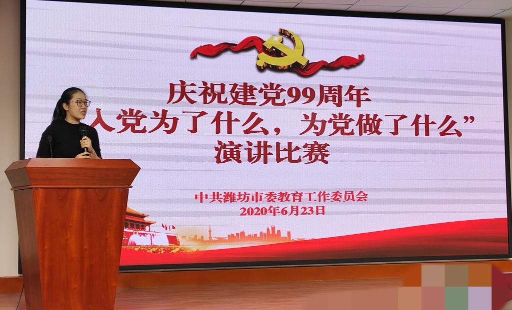为热烈庆祝中国共产党成立99周年,进一步加强教育系统党的建设,强化思政教育和爱国主义教育,6月23日上午,由潍坊市委教育工委主办的“入党为了什么,为党做了什么”主题演讲比赛在市委教育工委党校举行。bv伟德国际商务学院党总支谭恒同志代表学院参加比赛并获二等奖。
