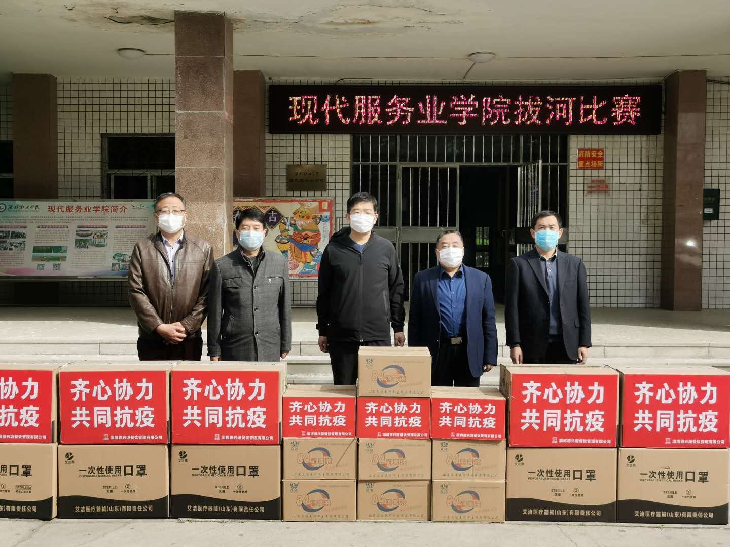 3月29日上午,淄博德兴源餐饮管理有限公司向bv伟德捐赠一万只口罩、十箱消毒液等防控物资。刘德强副院长及后勤服务处负责同志出席了捐赠仪式。