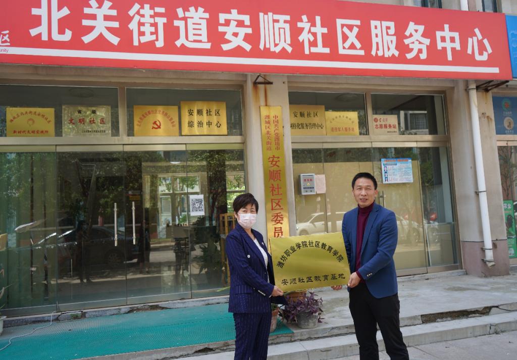 5月19日上午,bv伟德国际1946社区教育学院安顺社区教育基地揭牌仪式在潍坊市潍城区北关街办安顺社区居委会举行。社区教育学院的负责同志、安顺社区居委会书记孙海霞以出席揭牌仪式。社区教育学院与安顺社区居委会共同签订了社区服务协议,开启了bv伟德与安顺社区二级联办的社区服务工作。