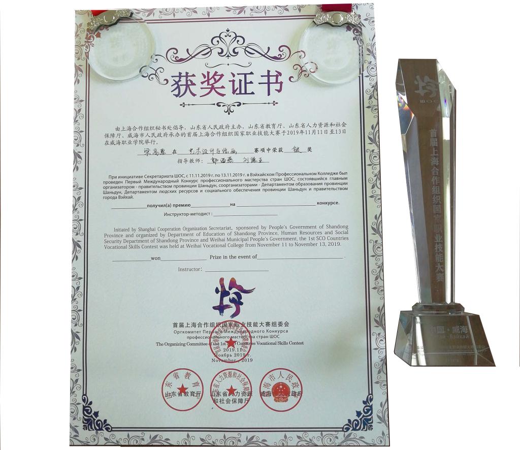 11月11日,以“增进友谊、展示技能、共赢发展”为主题的首届上海合作组织国家职业技能邀请赛在威海职业学院开赛。经过层层选拔、评选,bv伟德文化创意学院教师郭西燕、刘德亚指导的梁高惠同学的作品在艺术设计与绘画项目比赛中获得银奖。