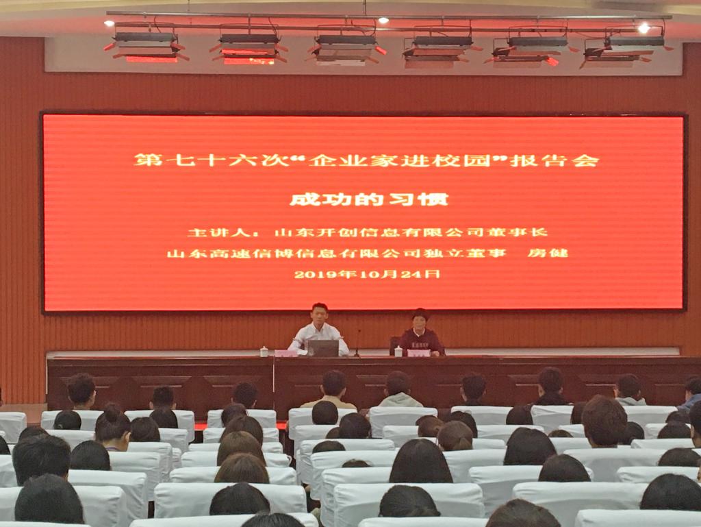 10月24日下午,学校第76次“企业家进校园”活动报告会在清泽楼报告厅举行。山东开创信息有限公司董事长房健作了“成功的习惯”主题报告。科技处(产学研合作中心)相关人员和经营管理学院300余名师生参加了报告会。