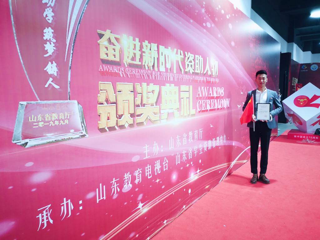 近日,山东省“奋进新时代资助人物”颁奖典礼在山东教育电视台演播大厅举行。我校2018届毕业生许英杰同学获评新时代学生资助人物“励志之星”荣誉称号。