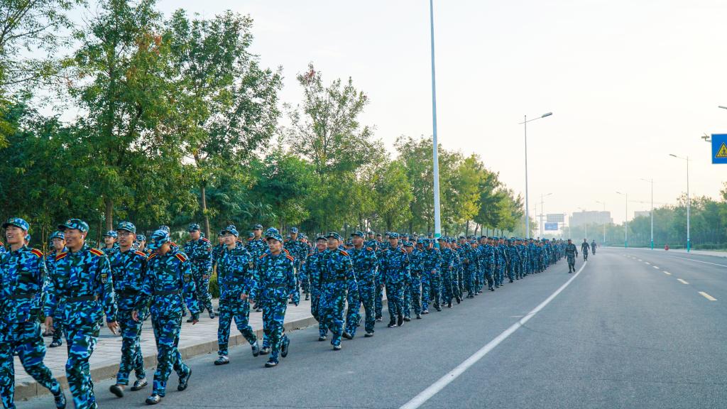 六点整,随着军训团团长“出发”的号令,滨海校区2019级全体学生在军训团教官的带领下,迈着整齐的步伐,喊着口号、唱着军歌,斗志昂扬,精神百倍。行军沿校外公路行进,徒步绕校行军一周,路程全长约5公里。团委学生工作处、安全保卫处、校卫生室及各二级学院相关同志全程参与,担负行军路线疏通及保障任务。