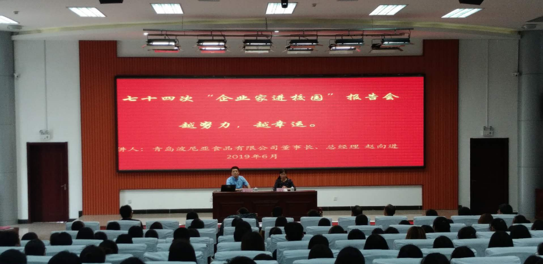 6月13日,bv伟德国际1946第74次企业家进校园活动在滨海校区明德讲堂举办。青岛波尼亚食品有限公司董事长赵向进以“努力奔跑,我们都是追梦人”为题,为食品药品学院教师和食品专业300余名同学作了一场精彩报告。报告会由食品药品学院负责人主持。