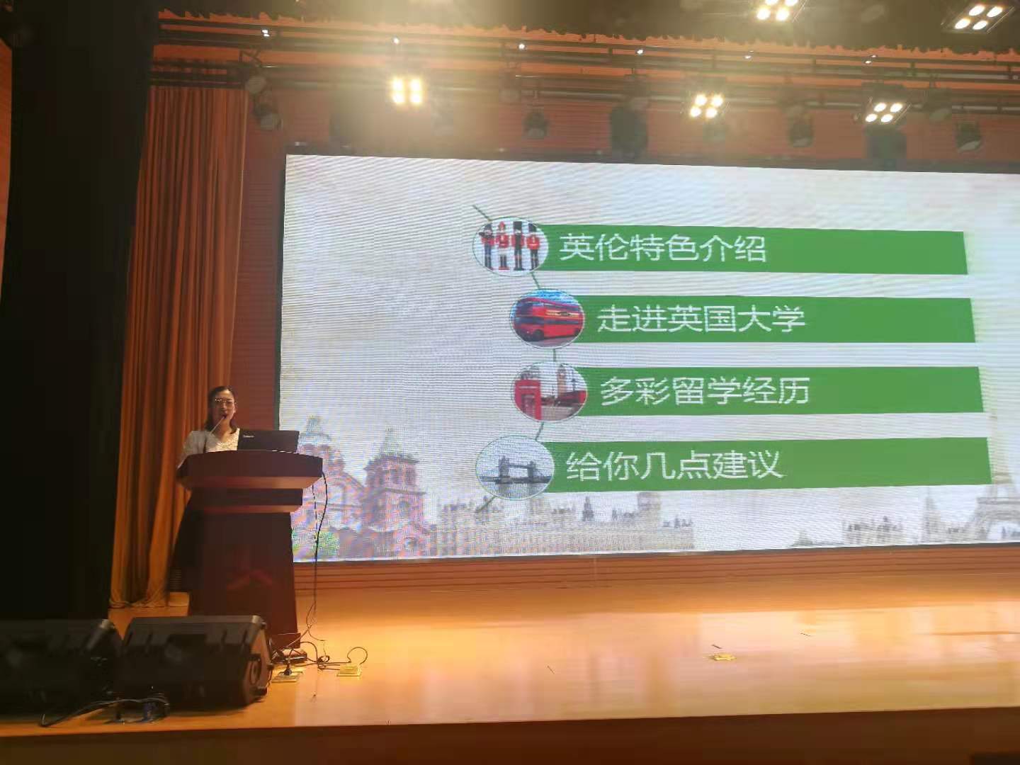 徐知萌毕业于英国布里斯托大学。她从大本钟、伦敦眼、泰晤士河等英伦特色景点讲起,简要介绍了英国的饮食文化、礼仪文化、节日文化和英国文学,重点向同学们传递了英国建筑所呈现出的独特的艺术魅力和深厚的文化底蕴;特别讲述了在英国不到25万平方公里的国土面积上分布着剑桥、牛津、帝国理工等多所世界百强学府,并借此鼓励同学们努力学习、提升学历,提高分析问题和解决问题的能力,将来能够背起行囊畅游世界;主讲人最后用英国最流行的励志话语“保持冷静 继续前行”结束了上半场讲座。