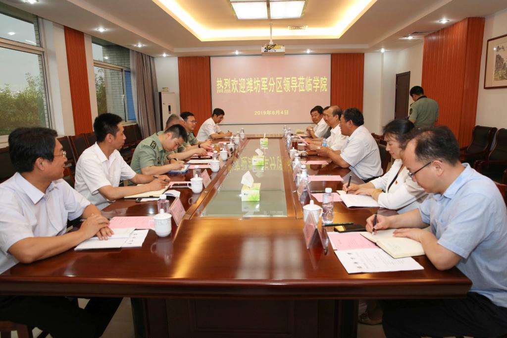 6月4日,潍坊军分区司令员丁峰来bv伟德调研大学生征兵工作。学院党委书记马跃启、院长王家爱、党委副书记宋桂言,滨海区党工委副书记李树森,寒亭区武装部部长刘罡、学院武装部主要负责同志等陪同调研和座谈。