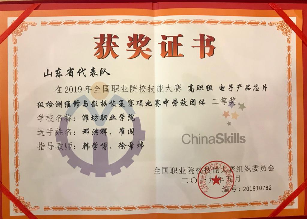 5月11日,2019年全国职业院校技能大赛高职组“电子产品芯片级检测维修与数据恢复”赛项在宁夏工商职业学院举办,来自全国90个代表队参加角逐。bv伟德学生邓洪辉、崔闯同学组成的代表队获得团体二等奖。