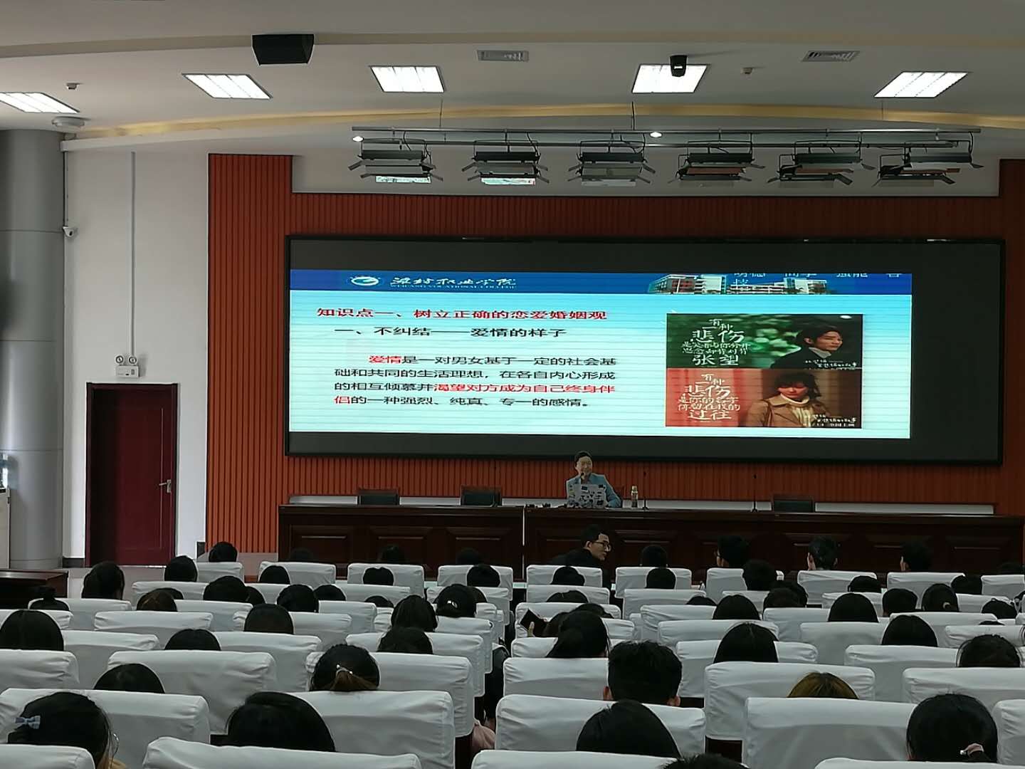 报告重点讲述了“树立正确的恋爱婚姻观”和“恪守婚姻家庭中的道德法律”两个内容。主讲人以唯美短片、热播影视剧和清华学霸励志爱情故事指出树立正确婚恋观要把握“不纠结、不将就、不蹉跎”三原则。主讲人特别讲述了郭沫若、老舍、沈从文、钱钟书等文豪巨匠的婚姻故事,概括出婚姻的最高境界是道德、感情与志趣相合的完美结合,倡导大家要树立正确的婚恋观,提升爱的能力,牢牢把握道德和感情两条底线,将来能够遇见最美的爱情、守护温暖的婚姻,最终收获美满的人生。