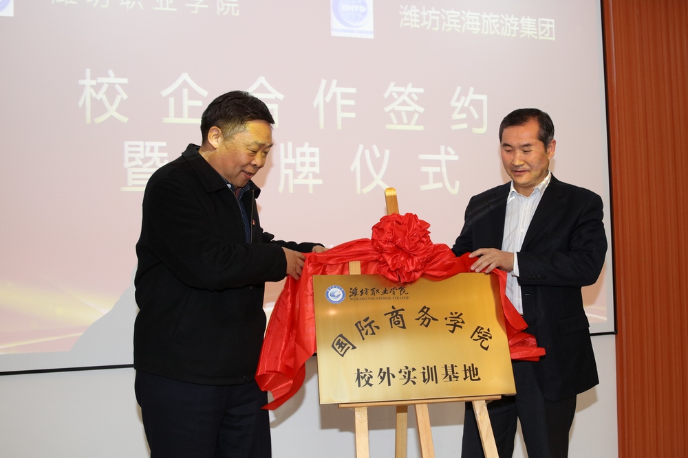 张洪全和李树森一起为“bv伟德国际1946校外实习基地”揭牌。贺志强与臧传奎共同签署了《bv伟德国际1946与潍坊滨海旅游集团有限公司校企合作协议》。