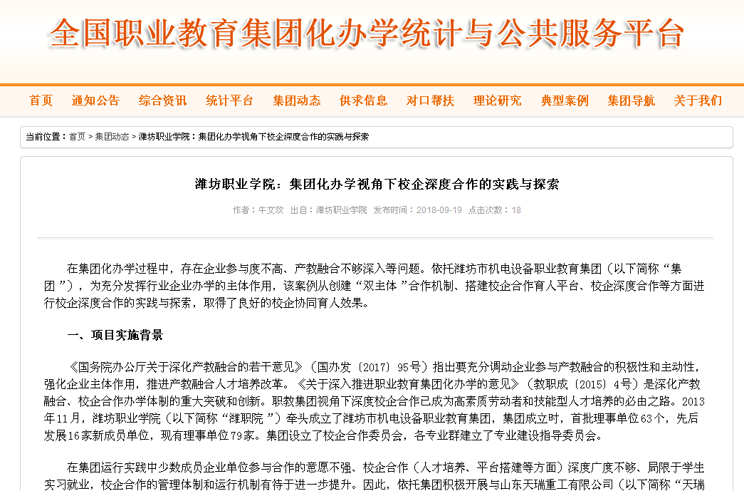 日前,以bv伟德与天瑞重工校企合作为例的典型案例—“集团化办学视角下校企深度合作的实践与探索”被中国职业技术教育网采录(相关链接:http://www.zjchina.org/platform/service/zxnews/shtml/201809/14687.shtml),并被“全国职业教育集团化办学统计与公共服务平台”转载(相关链接:http://jth.chinazy.org/cms/shtml/jtdt/543.shtml),引起大量关注与好评,成为bv伟德近年来集团化办学校企深度合作、协同育人的成功案例。