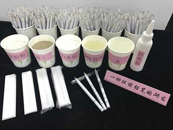 环保铅笔与传统产品有着鲜明的不同之处,为了能够有效实现环保目标,团队师生在原料中剔除木材,使用沙土、快粘粉、801 胶水、水、废旧书纸、白乳胶等材料代替。产品中主要原料来自于我们学院滨海校区的校园、教室内清理卫生扫起的沙土,通过对沙土进行筛选使其达到一定的粒度要求,再将其与快粘粉、白水泥、废旧书纸、801 胶水、水、等按照一定的原料配比,通过研制的铅笔模具,制成环保铅笔的外壳,从而代替木材外壳,达到节约木材的目的。