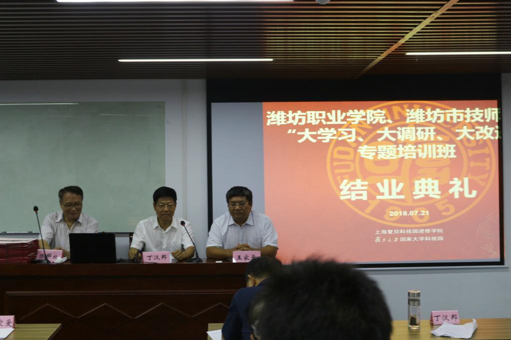 在结业典礼上,陈解放为两个学院的学员代表颁发了结业证书。潍坊市技师学院院长丁汉邦作了总结讲话,他对复旦大学科技进修学院表示了感谢,并对本次培训活动作了高度评价。他指出,本次培训班,开创了潍坊市两个学院联合开展领导干部集训的先河,不仅收获了先进的职教理念和知识,也接受了上海城市文化及复旦大学校园文化的熏陶,更是按受了一次鲜活的党性教育和心灵洗礼,同时,本次培训班,进一步加深了bv伟德国际1946和潍坊市技师学院的友谊,为今后两个学院的深度合作和建设发展奠定了良好基础。(邢同胜供稿)