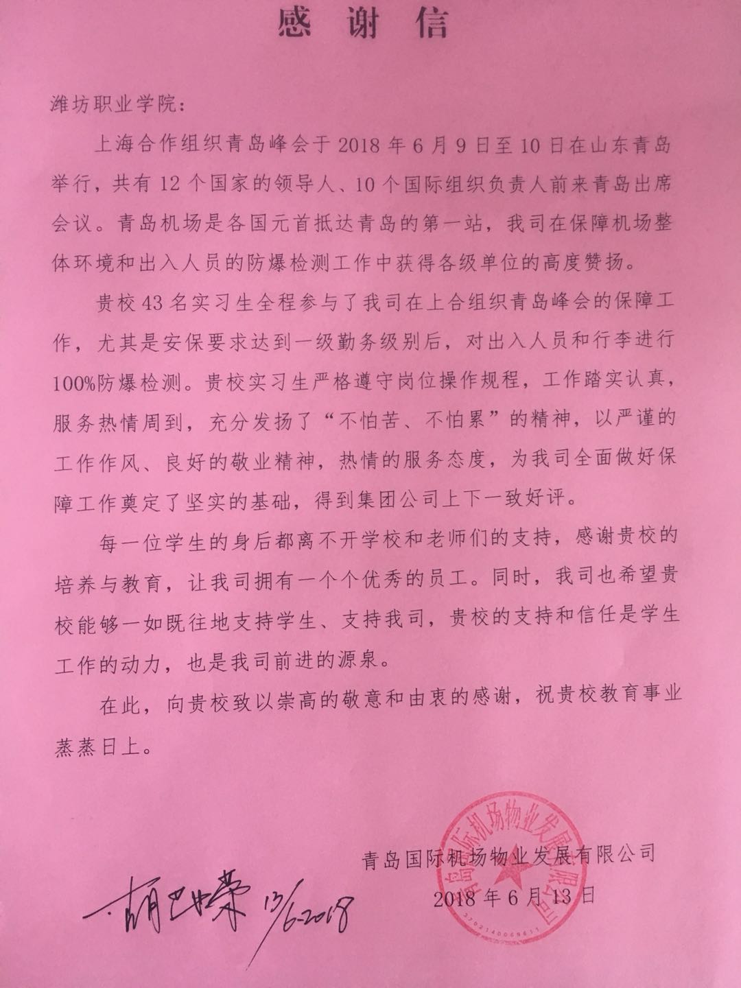 经过前期两周的适应期,学生们在6月份青岛上合峰会召开期间,在工作岗位上以标准的动作、得体的举止、规范的语言等服务于每一位通过青岛机场的中外旅客,她们的出色表现为青岛上合峰会亮出了防爆安检的新名片,得到了机场领导和过往旅客的交口称赞,树立了机场安检的良好形象,也为bv伟德国际1946赢得了良好的社会口碑。(梁延安 李桂杰供稿)