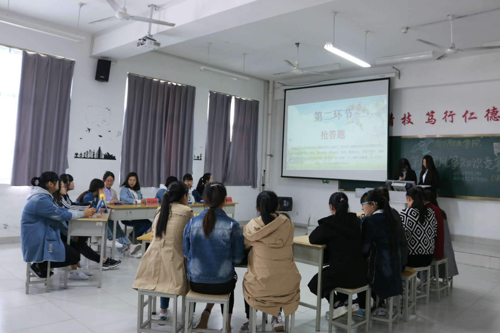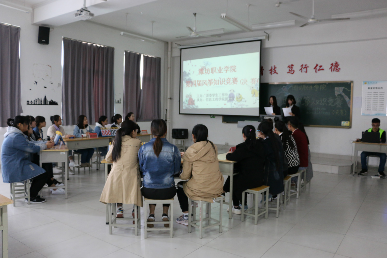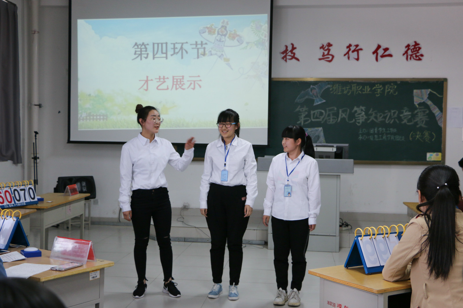 决赛于4月24日下午在滨海校区惠泽2号楼B区512教室成功举办,决赛采用现场竞答的方式,包含必答题、抢答题、风险题和才艺展示四个环节。必答题环节考验选手们的基本知识积累,抢答题环节是选手们敏锐度的大比拼,风险题环节体现了选手们的自信心和传统文化涵养,才艺展示环节则让同学们享受了一道传统文化大餐。比赛中,各参赛队伍表现积极,反应机敏,知识储备量大,整场比赛紧张有趣,现场观众领略了潍坊风筝文化知识的博大精深,更是被选手们深厚的风筝文化知识素养和机敏反应所折服,不时报以热烈的掌声。最终,信息工程学院夺得本届风筝知识大赛的冠军,国际商务学院和文化创意学院获得最佳才艺展示奖。