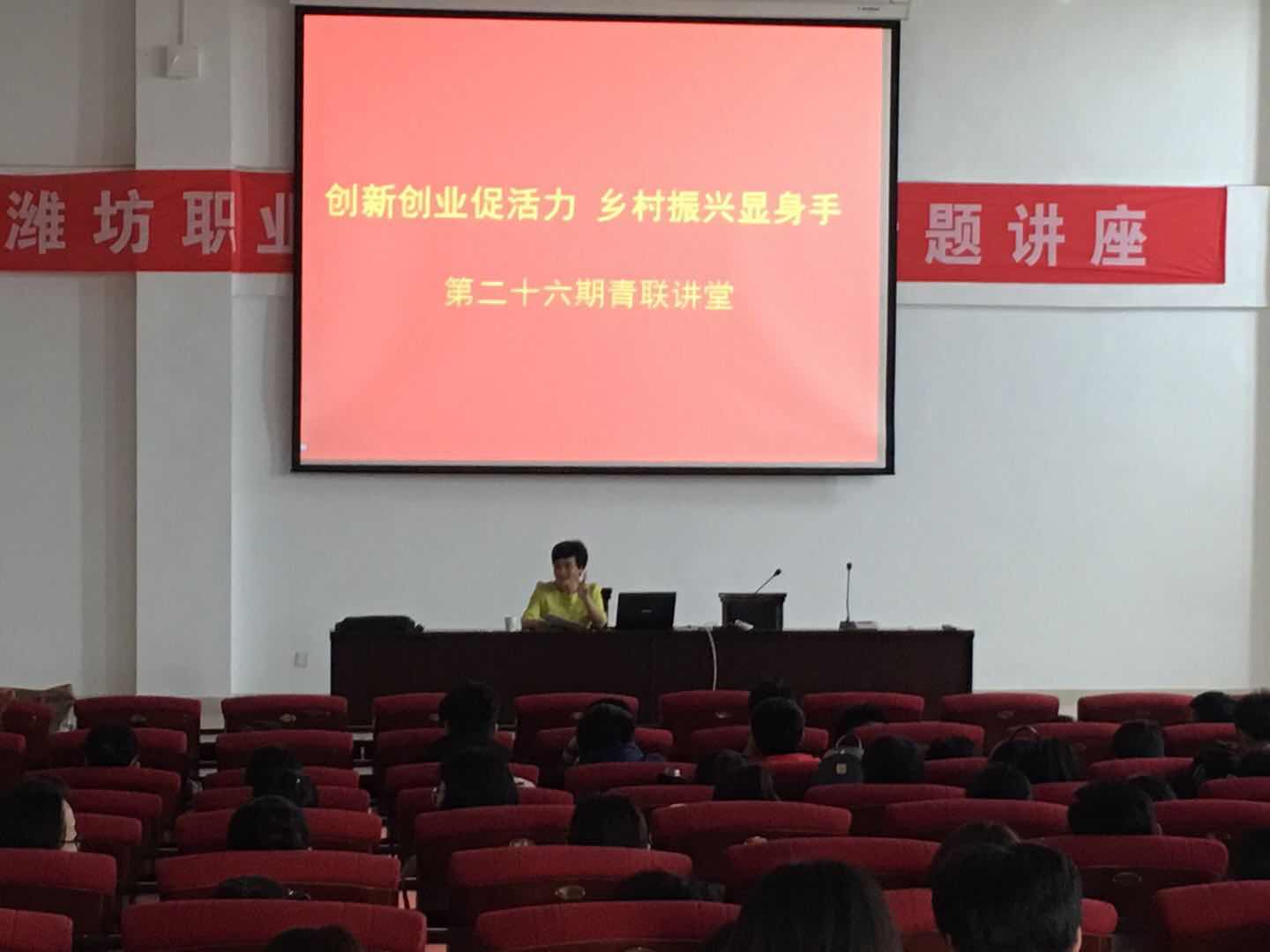 4月24日下午,“小乐西瓜”创始人宋会灵女士、潍坊市大中专毕业生就业指导中心黄训涛科长及相关人员,到bv伟德滨海校区清泽楼413室进行了农产品领域创业知识讲座,创业教育学院相关人员、农林科技学院及食品药品学院170余名学生听取了报告。