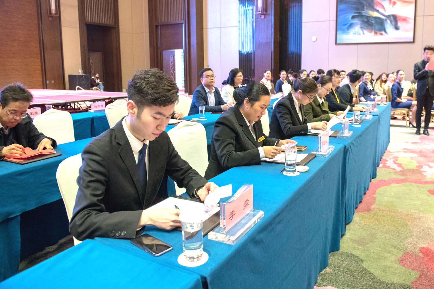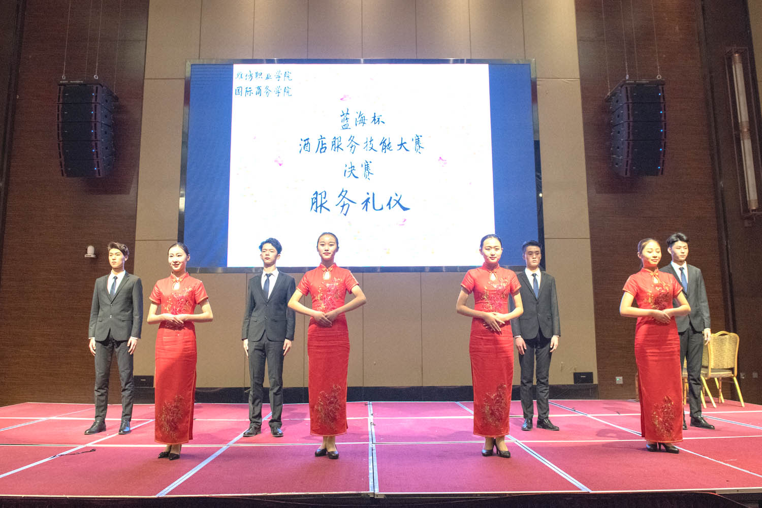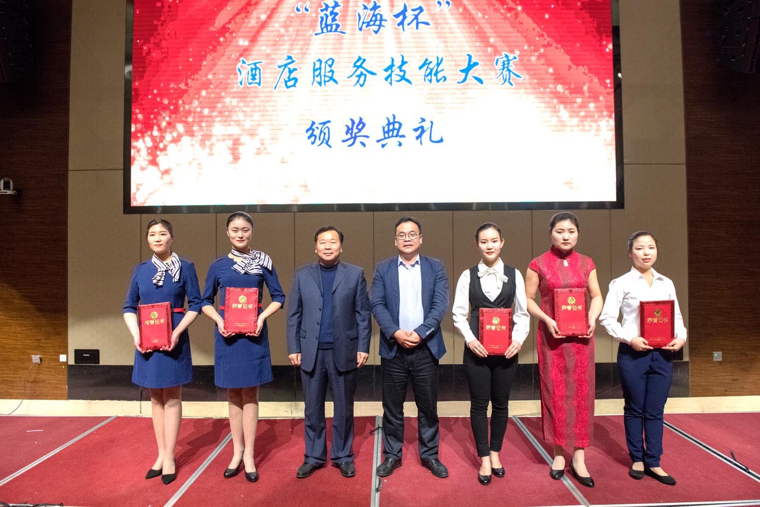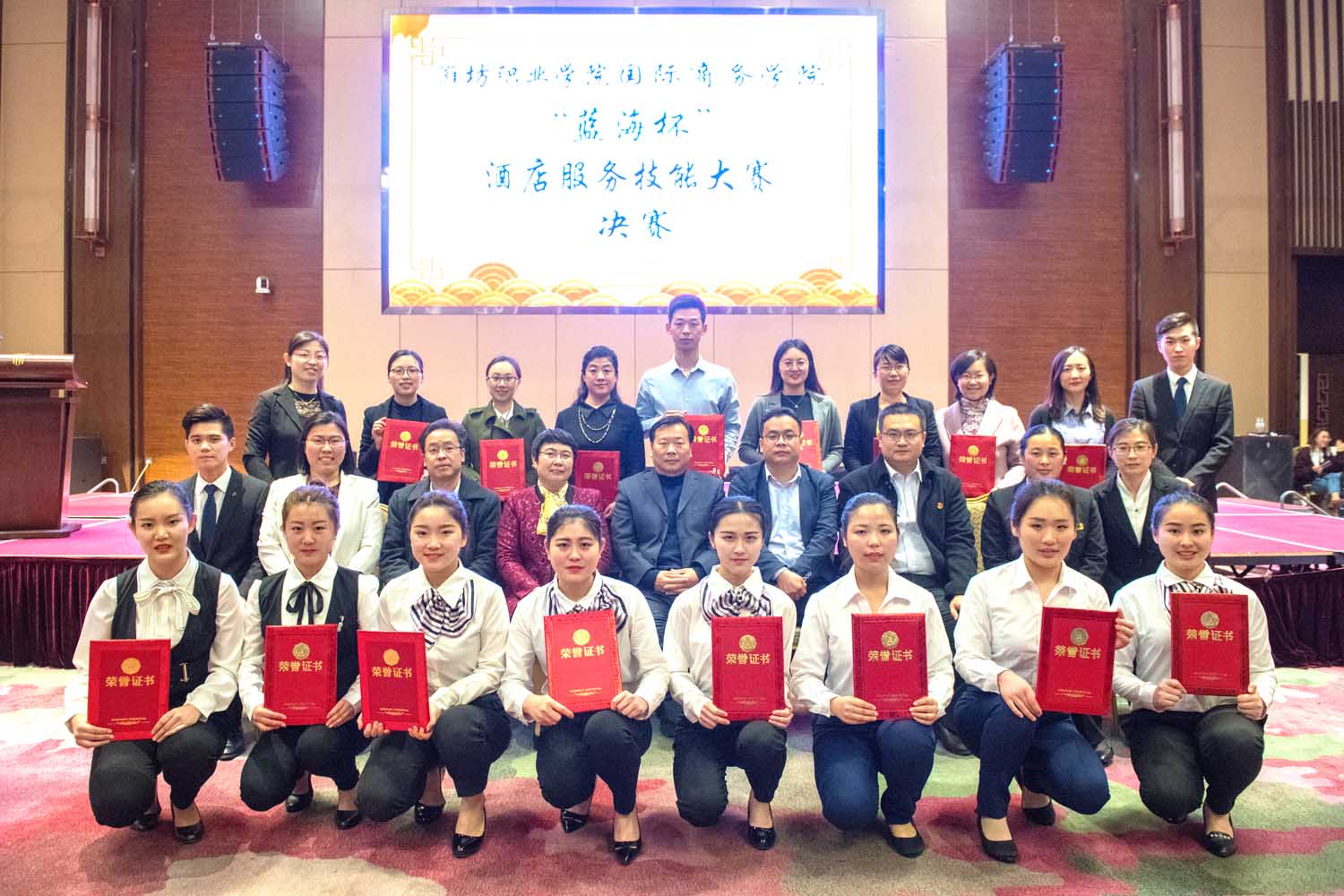 4月3日,2018年“蓝海杯”国际商务学院酒店服务技能大赛决赛在潍坊蓝海大饭店成功举办。学院副院长贺志强出席颁奖仪式,蓝海酒店集团人力资源中心副总经理杨兆永讲话,潍坊蓝海大饭店总经理纪荣波致辞,国际商务学院主要负责同志发言,经过激烈角逐共评出一等奖11名、二等奖14名、三等奖17名,充分展示了参赛选手过硬的职业技能和良好的竞技水平。
