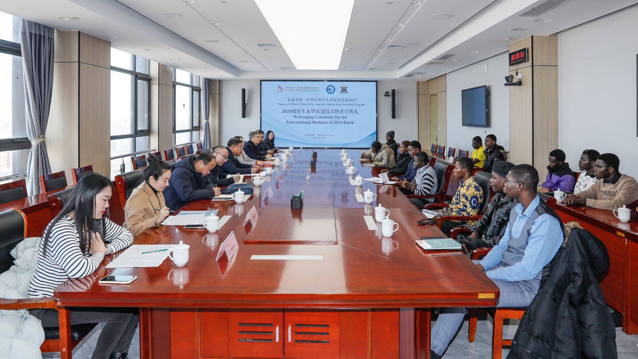 韩瑞东向来自加纳的15名新生表示热烈的欢迎,并介绍了潍坊市和学院的基本概况及“未来非洲”项目的发展情况,对同学们提出三点希望和要求,希望同学们做勤学善思的践行者、做文化交流的使者、做中非友谊的传承者。