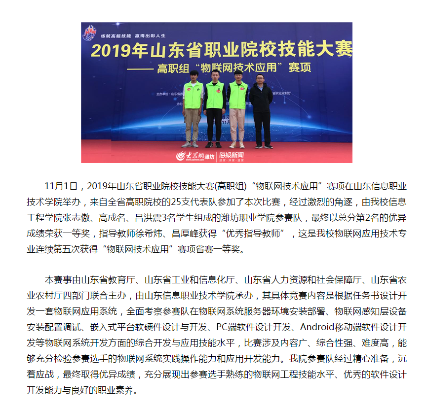 [大众网]bv伟德国际1946获2019年山东省职业院校技能大赛“物联网技术应用”赛项一等奖