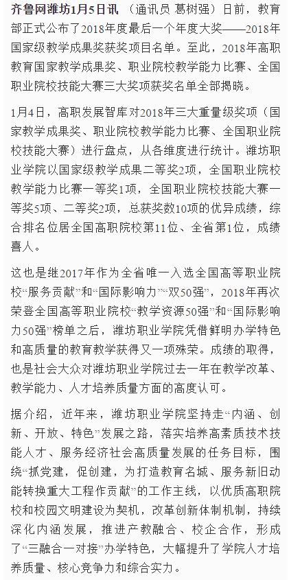 [齐鲁网]潍坊这所高校厉害了!高职教育国家三大奖项排名全国第十一全省第一