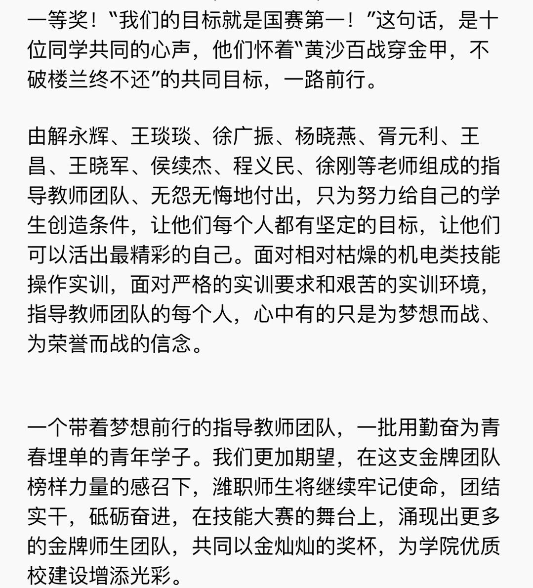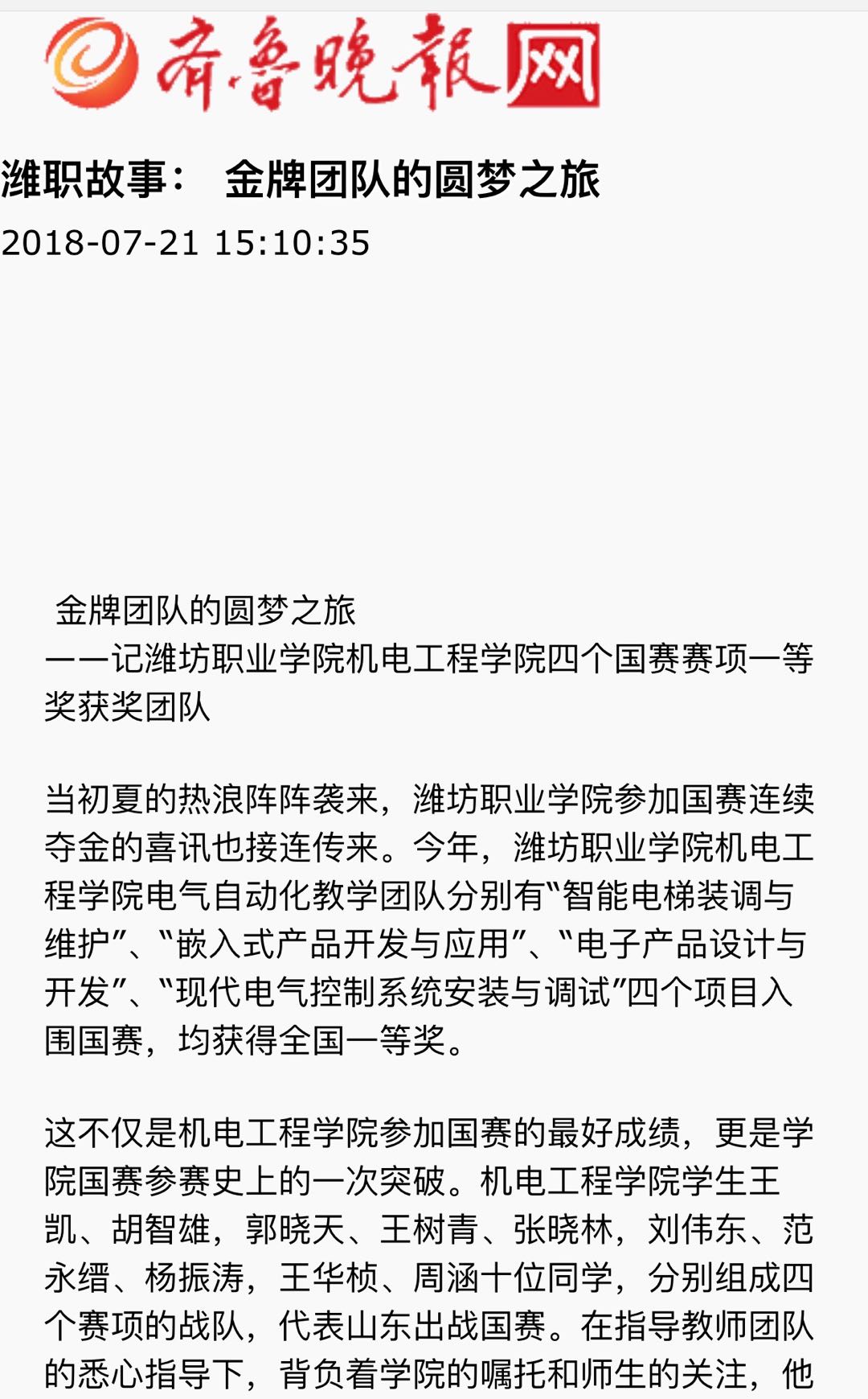 [齐鲁晚报]潍职故事:金牌团队的圆梦之旅——记bv伟德国际1946机电工程学院四个国赛赛项一等奖获奖团队