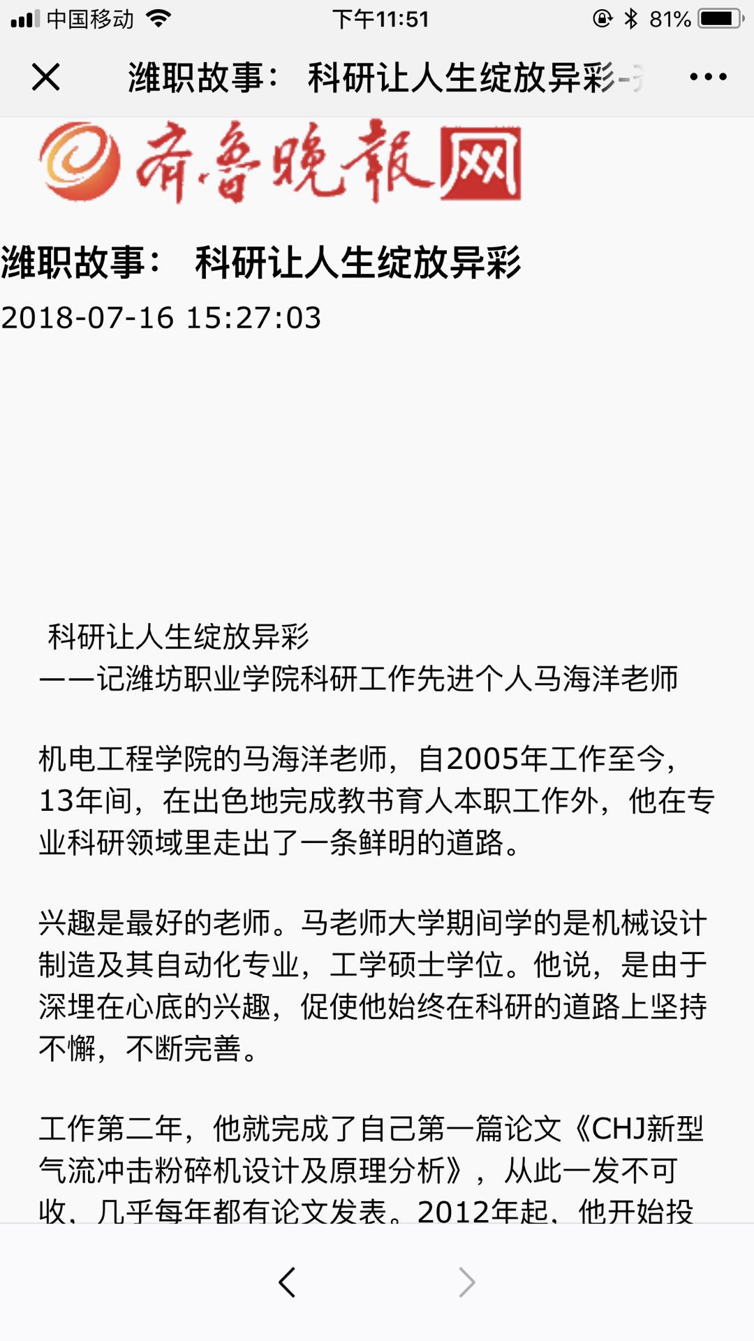 [齐鲁晚报]潍职故事:科研让人生绽放异彩——记bv伟德科研工作先进个人马海洋老师