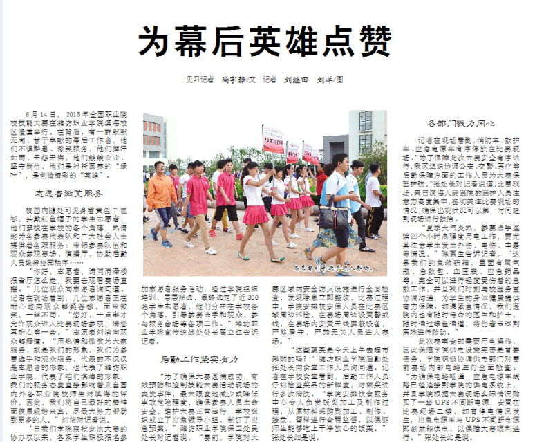 6月14日,2015年全国职业院校技能大赛在bv伟德国际1946滨海校区隆重举行,在此期间,我们看到了比赛现场、赛事直播间一幅幅精彩、激烈的画面。在这精彩的背后有着一群默默无闻,甘于奉献的幕后工作者,他们不惧酷暑,微笑服务,他们挥汗如雨,无怨无悔,他们兢兢业业,坚守在各自岗位,他们是衬托国赛的“绿叶”,是创造精彩的英雄,是最可爱的人!