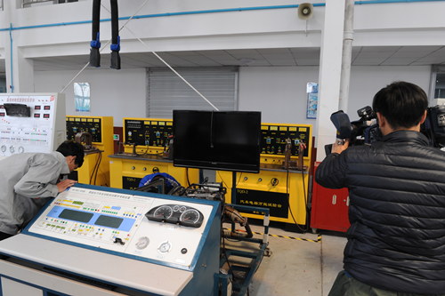 在汽车维修实训车间,同学们相互配合,在操作台完成了汽车发动机故障检查、拆卸、维修等工作。实训车间的汽车电器万能试验台等设备,能够模拟各种故障,帮助提升学生的动手能力。