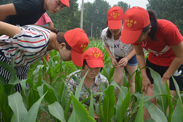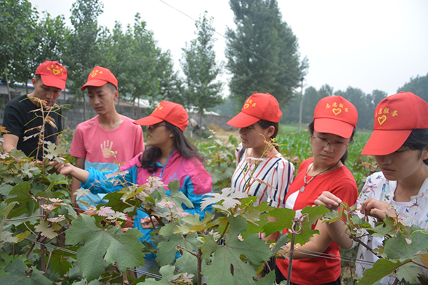 实践团队在指导老师的带领下,与峡山生态经济发展区郑公街道潘刘屯村包村“第一书记”安守强同志对接,随村主任等工作人员和部分农户一起深入田间地头,了解当地农业生产和农村经济发展现状。师生通过对当地的村容村貌、人员结构、气候、土壤、生态环境及交通等特点的了解,和村委工作人员一起分析了当地发展中存在的问题、发展生态农业的有利条件,并提出了发展生态旅游农业的设想。同时青年志愿者们在bv伟德农业生产专家席敦芹教授的指导下,对玉米、酿酒葡萄的生长进行了观察,席教授耐心细致的指导青年志愿者们识别玉米生长常见病虫害、辨别酿酒葡萄与食用葡萄的不同,通过对比不同田地的葡萄生长状况,让同学们认识到了精细化管理的重要性。