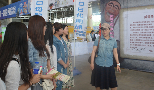 这是该院实行的多导师“联教”动态课堂教学,授课地点选择在了富华会展中心2015中韩商品交易会的现场。来到会展中心之后,先由国际贸易教研室专业教师向学生们介绍了进出口公司的基本业务范围、展会布展的基础知识、商品进出口外贸方面的相关知识等,随后应用韩语教研室专业教师带领同学们边观展边学习。看着琳琅满目的韩国商品,大家跟随授课教师跟读商品名称的同时学习单词的拼写。专业教师还根据自己在韩国的留学经验介绍了各种商品在韩国的用途和受欢迎程度。参展商和来购物的群众对于这种教学模式纷纷点赞。