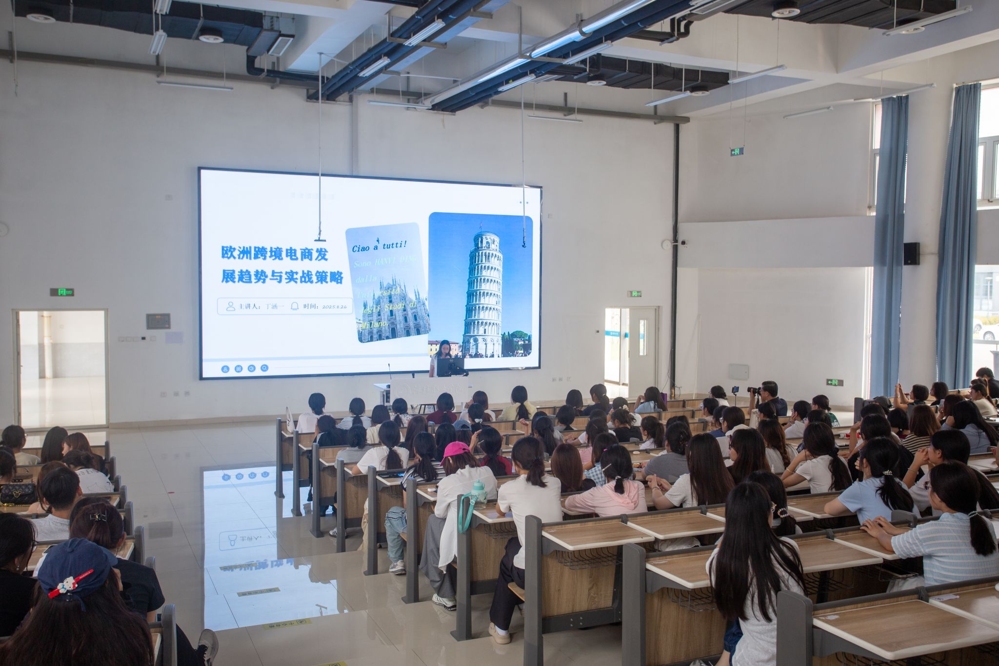 为进一步深化产教融合,赋能专业人才培养,强化学生实践素养培育与国际视野拓展,8月28日,信息工程学院与国际商务学院在智泽1号楼A119教室联合举办“企业专家进校园”专题讲座活动。活动特邀潍坊翰林轩文化有限公司跨境电商领域专家丁涵一担任主讲嘉宾,信息工程学院电子商务专业与国际商务学院国际贸易专业教师及220余名学生参加。