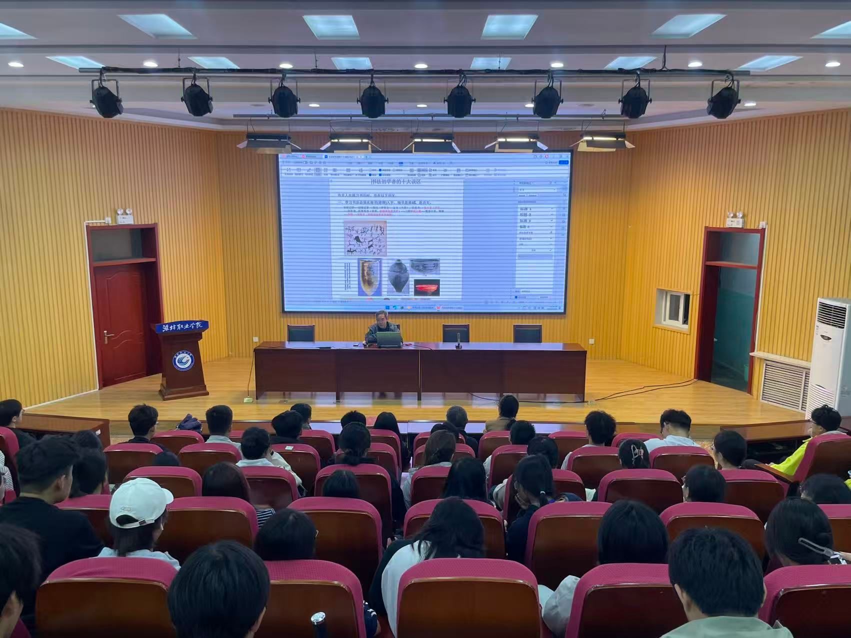 王春之教授开展书法科普讲座。讲座中,王教授从书法艺术的历史演进脉络切入,着重阐释了笔法、字法、章法、墨法这“书法四要素”的核心内涵,并结合自身多年的教学与创作经验,从执笔姿势、运笔方法、选帖标准、临帖步骤等方面,系统分析了书法初学者常见的误区。随后,王教授与艺术设计类专业骨干教师围绕“书法课程体系建设”“传统书法在现代美术教学中的应用”等议题开展专题座谈会。