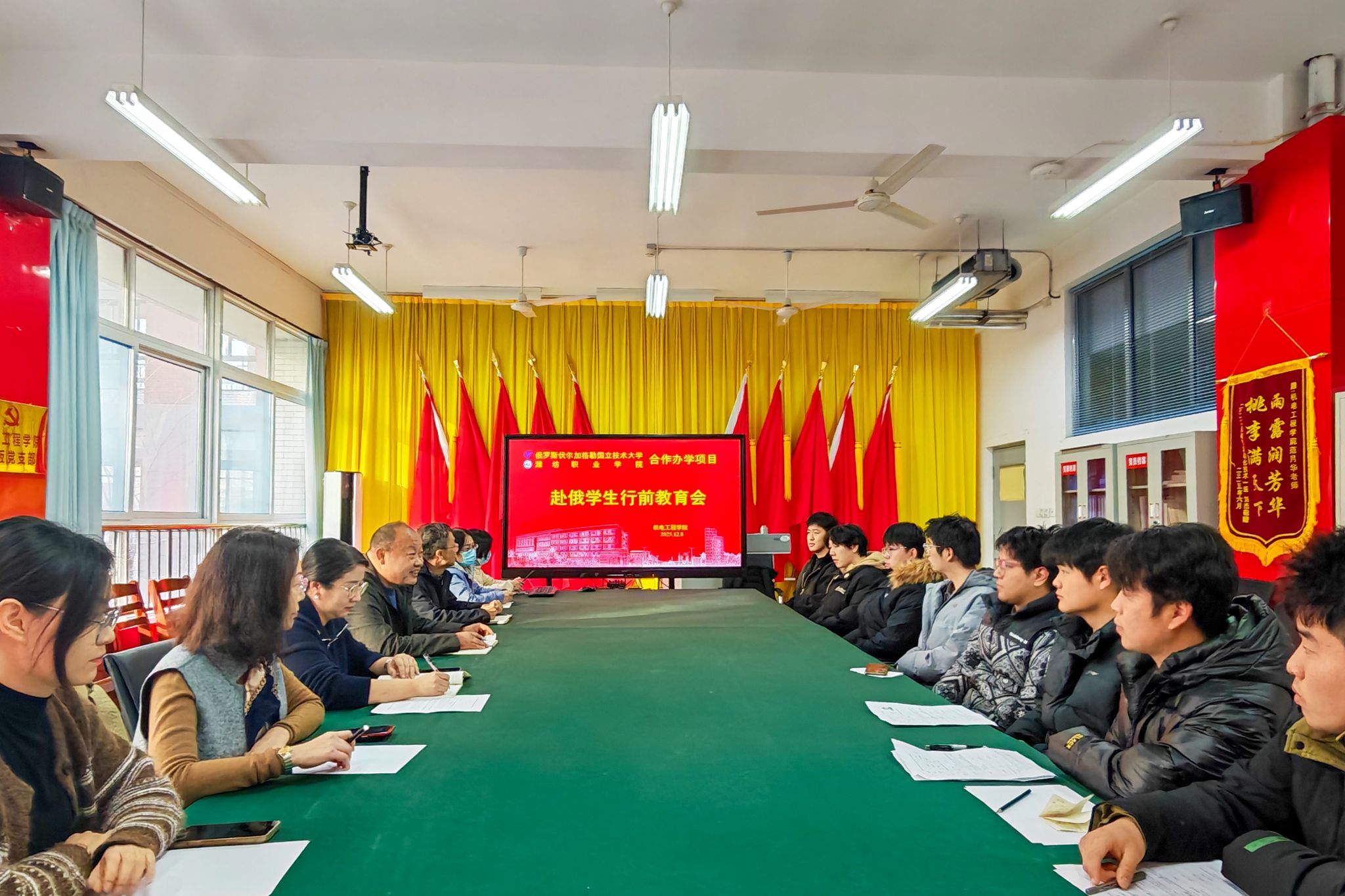 为扎实推进中俄合作办学项目落地见效,帮助即将赴俄留学的学子做好充分准备、顺利开启海外求学之旅,12月8日,机电工程学院在惠泽2A-221会议室召开赴俄学生行前教育会,机电工程学院主要负责人、国际交流处副处长、电气自动化技术教研室负责人、相关教师、中俄班辅导员以及即将赴俄罗斯留学学生共同参加会议。