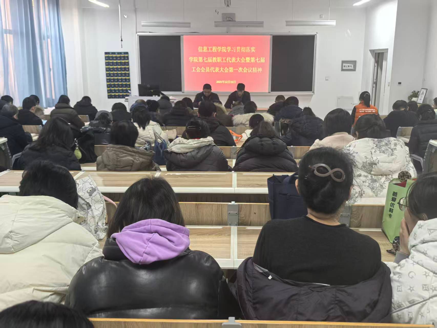 12月15日下午,信息工程学院在滨海校区智泽1号楼A216召开学习贯彻落实学院第七届教职工代表大会、第七届工会会员代表大会第一次会议精神专题会议。全体教师参加。