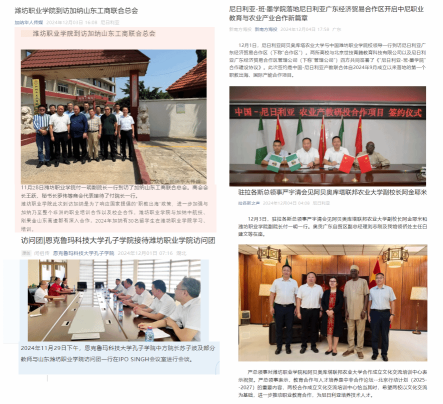 为推进“未来非洲-中非职业教育合作计划”“网络中文课堂”“班·墨学院”等项目,发展高质量“职教出海”,2024年11月27日至12月4日,应加纳库马西技术大学、尼日利亚阿费·巴巴罗拉大学邀请,学院党委委员、副院长付一明率团访问了加纳、尼日利亚高校、企业等单位和机构,国际交流与合作处、农林科技学院、机电工程学院和汽车工程学院等负责同志随团出访。
