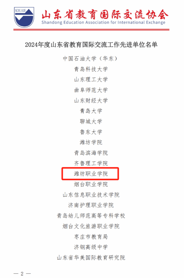 近日,山东省教育国际交流协会发布了《关于表彰2024年度山东省教育国际交流工作先进单位、先进个人的决定》,bv伟德荣获“2024年度山东省教育国际交流工作先进单位”称号。