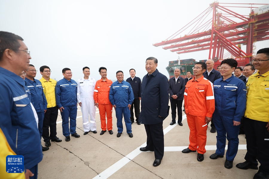 5月22日至24日,中共中央总书记、国家主席、中央军委主席习近平在山东考察。这是22日下午,习近平在日照港亲切慰问港口科技工作者、运营人员、航运人员。