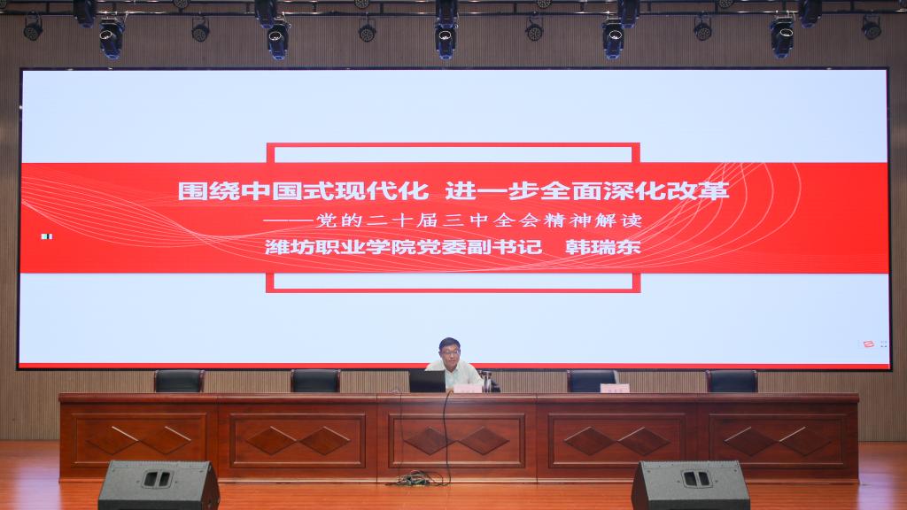 韩瑞东以“围绕中国式现代化 进一步全面深化改革”为题,从深刻认识党的二十届三中全会的主题和重大意义,深刻领会进一步全面深化改革的指导思想、总目标和重大原则,全面准确理解进一步全面深化改革的重大举措,深入贯彻落实全会精神、促进学院高质量发展等方面,对党的二十届三中全会精神进行了深入解读和专题辅导。
