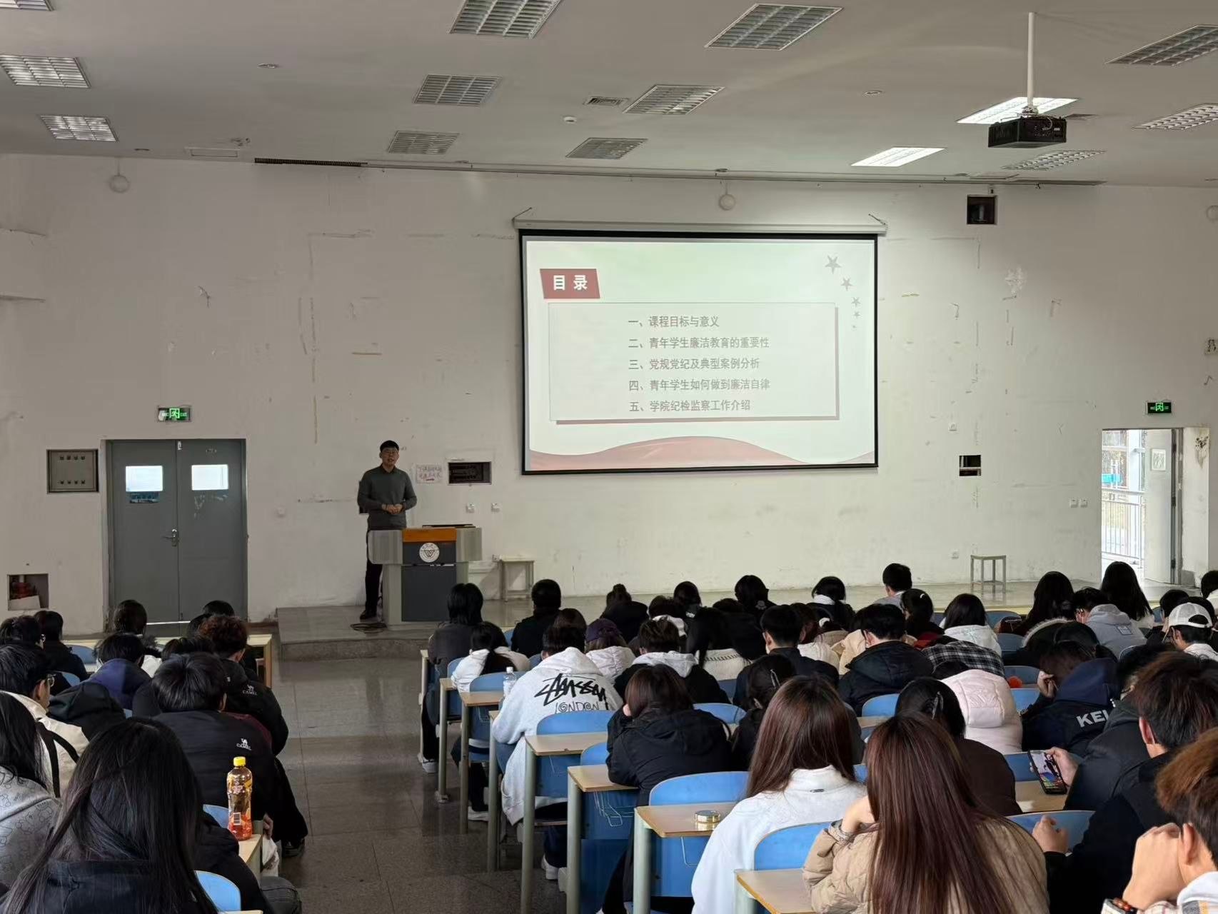 为落实立德树人根本任务,加强新时代廉洁文化建设,帮助新生系好人生“第一粒纽扣”,树立正确的价值观和行为准则,11月13日下午,纪检监察办公室在滨海校区惠泽1号楼报告厅举办2025级新生“明纪知廉筑根基,青春逐梦守初心”党规党纪及廉洁教育讲座,全院240余名新生参加活动。