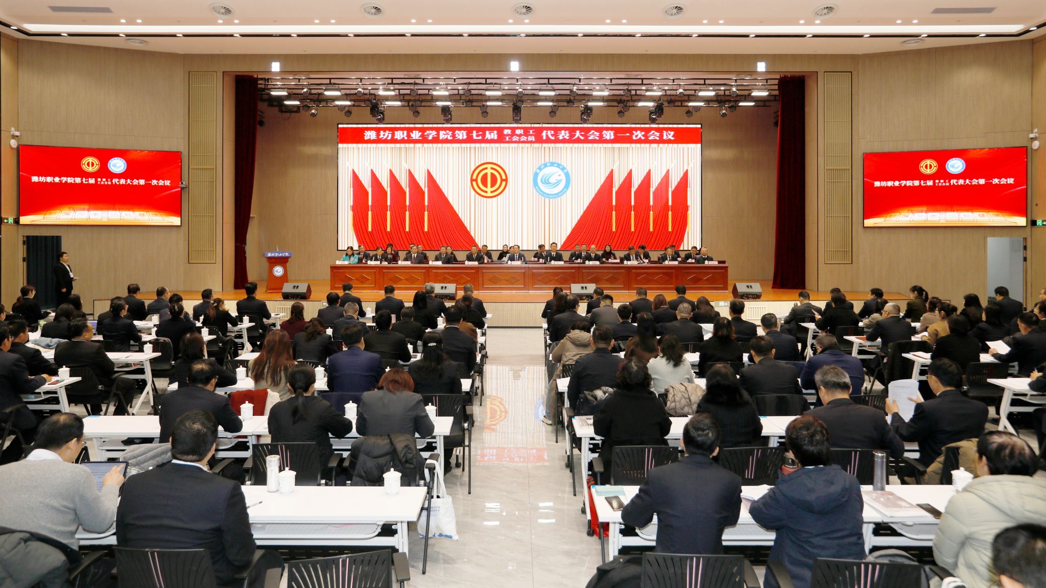 12月11日,bv伟德国际1946第七届教职工代表大会第一次会议、第七届工会会员代表大会第一次会议在综合楼报告厅举行,山东省教育工会发来贺信。潍坊市总工会党组成员、副主席徐连奎出席开幕式并讲话,学院党委书记王浩、院长韩瑞东等党政领导班子成员、大会主席团成员和特邀代表在主席台就座。学院正式代表、特邀代表、列席代表200余人参会。