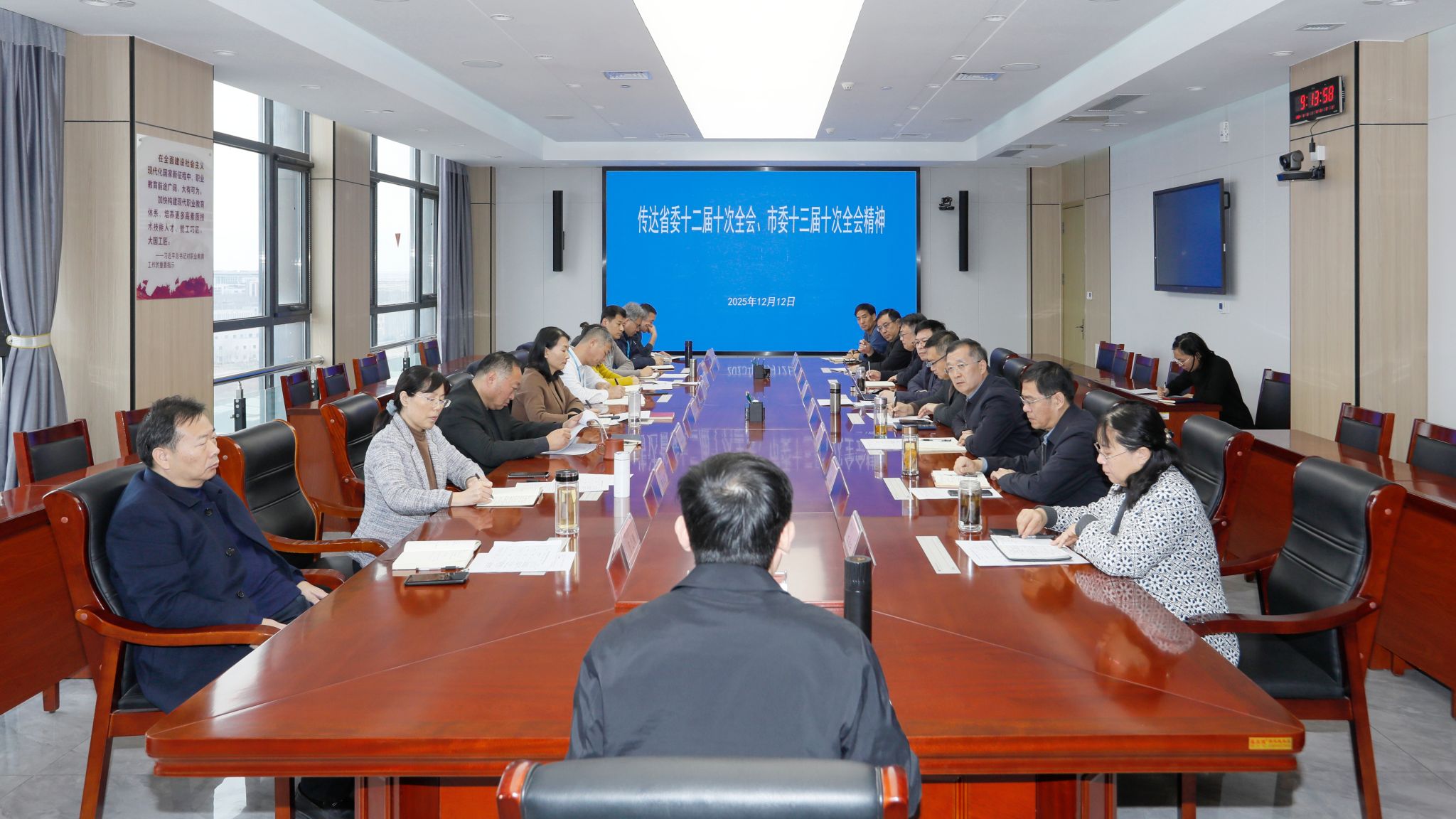 会议指出,省委十二届十次全会和市委十三届十次全会是在“十四五”收官、“十五五”谋划的关键节点召开的重要会议。省委十二届十次全会以习近平新时代中国特色社会主义思想为指导,深入学习贯彻党的二十届四中全会精神,全面总结了我省“十四五”时期取得的重大成就,深刻阐明了“十五五”时期山东发展所处的历史方位、面临的形势任务,对未来五年发展作出了总体规划和系统部署。市委十三届十次全会紧扣省委部署,紧密结合潍坊实际,系统总结了我市“十四五”发展成就,明确了“十五五”时期全市经济社会发展总体要求、遵循原则、主要目标和战略举措。省委十二届十次全会和市委十三届十次全会分别审议通过了《中共山东省委关于制定山东省国民经济和社会发展第十五个五年规划的建议》《中共潍坊市委关于制定潍坊市国民经济和社会发展第十五个五年规划的建议》,擘画了未来五年省、市发展宏伟蓝图,为学院对接区域需求、实现高质量跨越发展指明了路径,我们必须提高政治站位,切实把思想和行动统一到党中央及省、市决策部署上来。